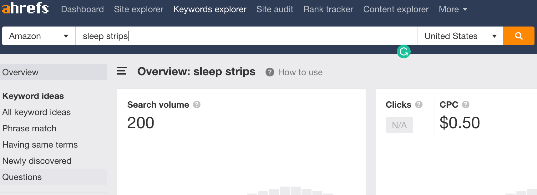 A quick search on Ahrefs reveals that if the company chose to use the generic term “sleep strips,” it would find that this particular keyword, though relatively low in search volume, gets more searches on Amazon.